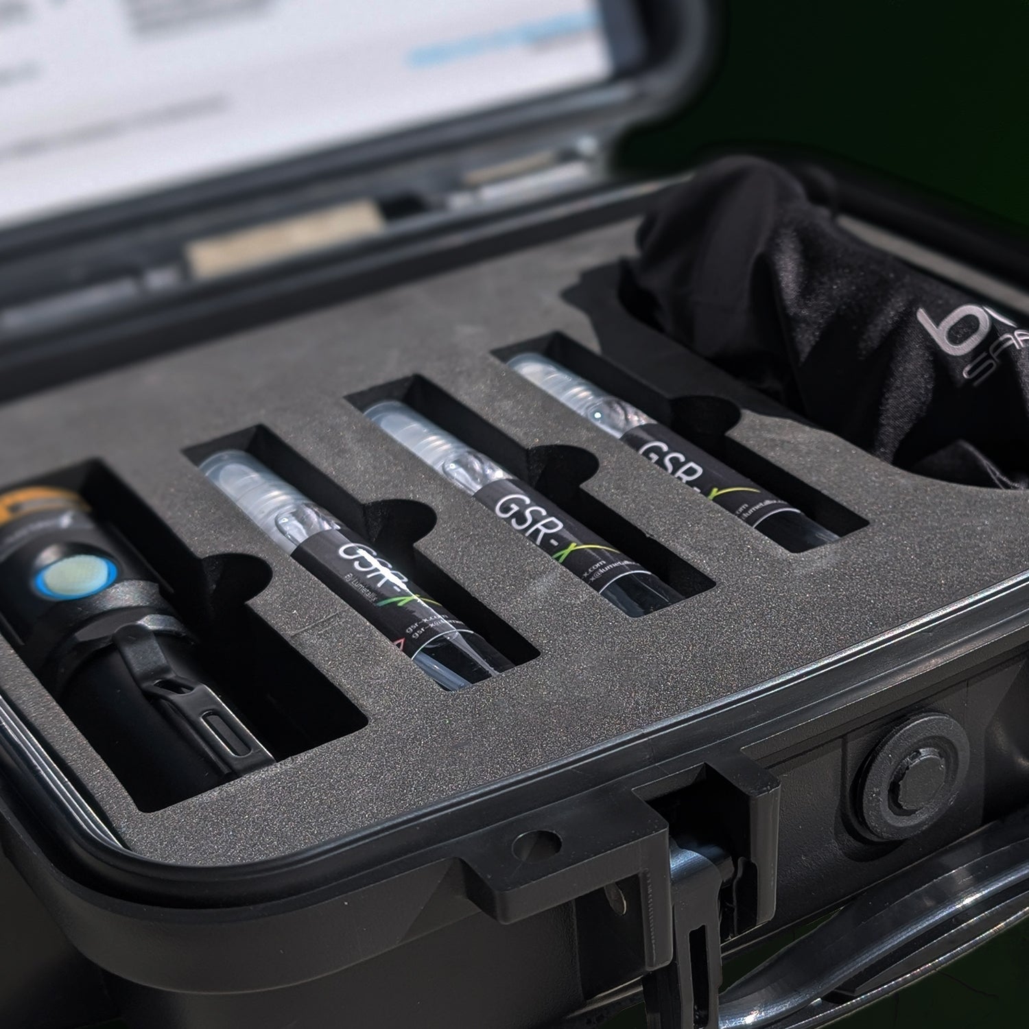 GSR-X1 is a multi-use kit developed for mapping GSR across entire crime scenes—ideal for spatial documentation and incident reconstruction.